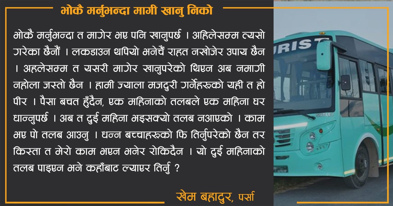 आज ४२ दिन भयो घरमा बसेको । म गाडीमा सहचालकको काम गर्छु । यो काम २०७० सालदेखि गर्दै आएको छु । महिनामा ७ देखि १० ट्रिपसम्म गर्थ्यो मेरो गाडीले । वीरगन्जदेखि पोखरासम्म र पोखरादेखि वीरगन्जसम्म आइपुग्दा कमाइ त्यस्तै ३००० देखि ३५०० रुपैयाँसम्म हुन्थ्यो । महिनाको तीसदेखि पैँतीस हजारसम्म मेरो कमाइ हुन्थ्यो । यही कमाइले घरमा मसहित चार जना पालिन्थ्यौँ ।