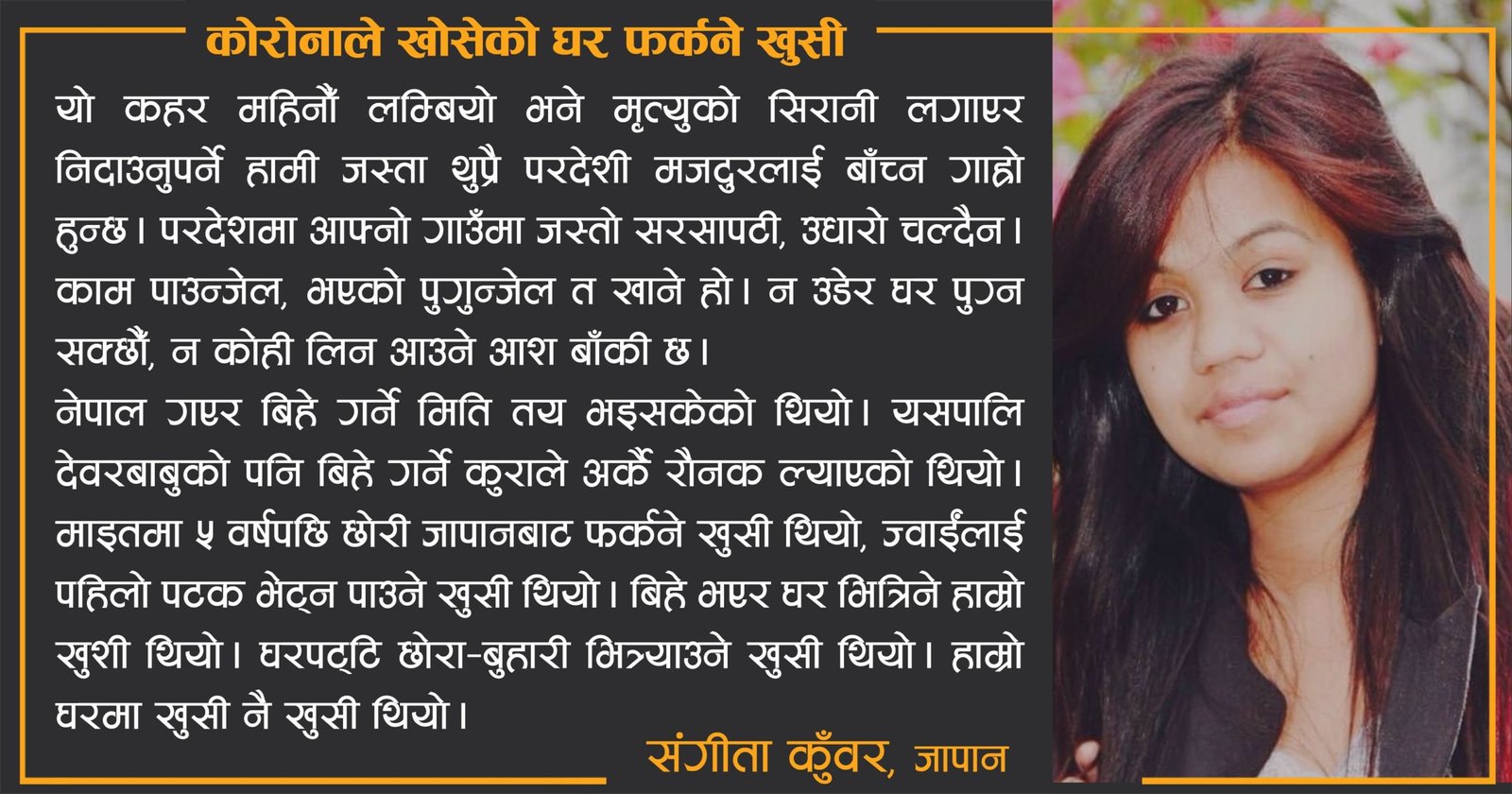 चीनमा कोरोनाको कहर सुरु हुनुअघि नै हामी नेपाल फर्कने निधो भएको थियो। चैत १४ गतेका लागि प्लेनको टिकट काटिसकेका थियौँ। नेपाल गएर बिहे गर्ने मिति तय भइसकेको थियो। यसपालि देवरबाबुको पनि बिहे गर्ने कुराले अर्कै रौनक ल्याएको थियो। माइतमा ५ वर्षपछि छोरी जापानबाट फर्कने खुसी थियो, ज्वाईंलाई पहिलो पटक भेट्न पाउने खुसी थियो। बिहे भएर घर भित्रिने हाम्रो खुसी थियो। घरपट्टि छोरा-बुहारी भित्र्याउने खुसी थियो। हाम्रो घरमा खुसी नै खुसी थियो।