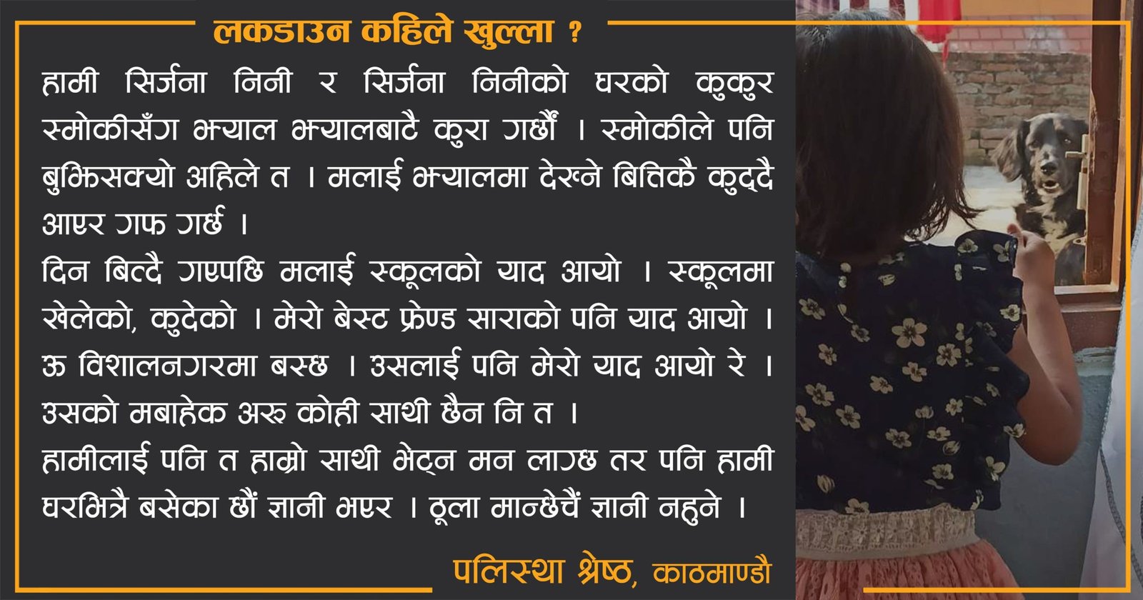 यसपालि स्कूल जाँदा धेरै कुरामा ध्यान दिनुपर्छ भनेर घरमा सबैले अनि स्कूलमा टिचरहरूले भनिराख्नुहुन्थ्यो । पहिला पहिला स्कूल बसमा मास्क लगाउनुपर्दैन थियो तर अहिले मास्क भुल्यो भने मामुले कराउनुहुन्थ्यो । अनि बाबाले स्यानिटाइजर ल्याइदिनुभएको थियो स्कूलमा, स्कूल बसमा हुँदा हातमा लगाउन । कोरोना भाइरसले गर्दा यस्तो गर्नुपरेको भन्नुहुन्थ्यो घरमा पनि स्कूलमा पनि सबै जनाले ।