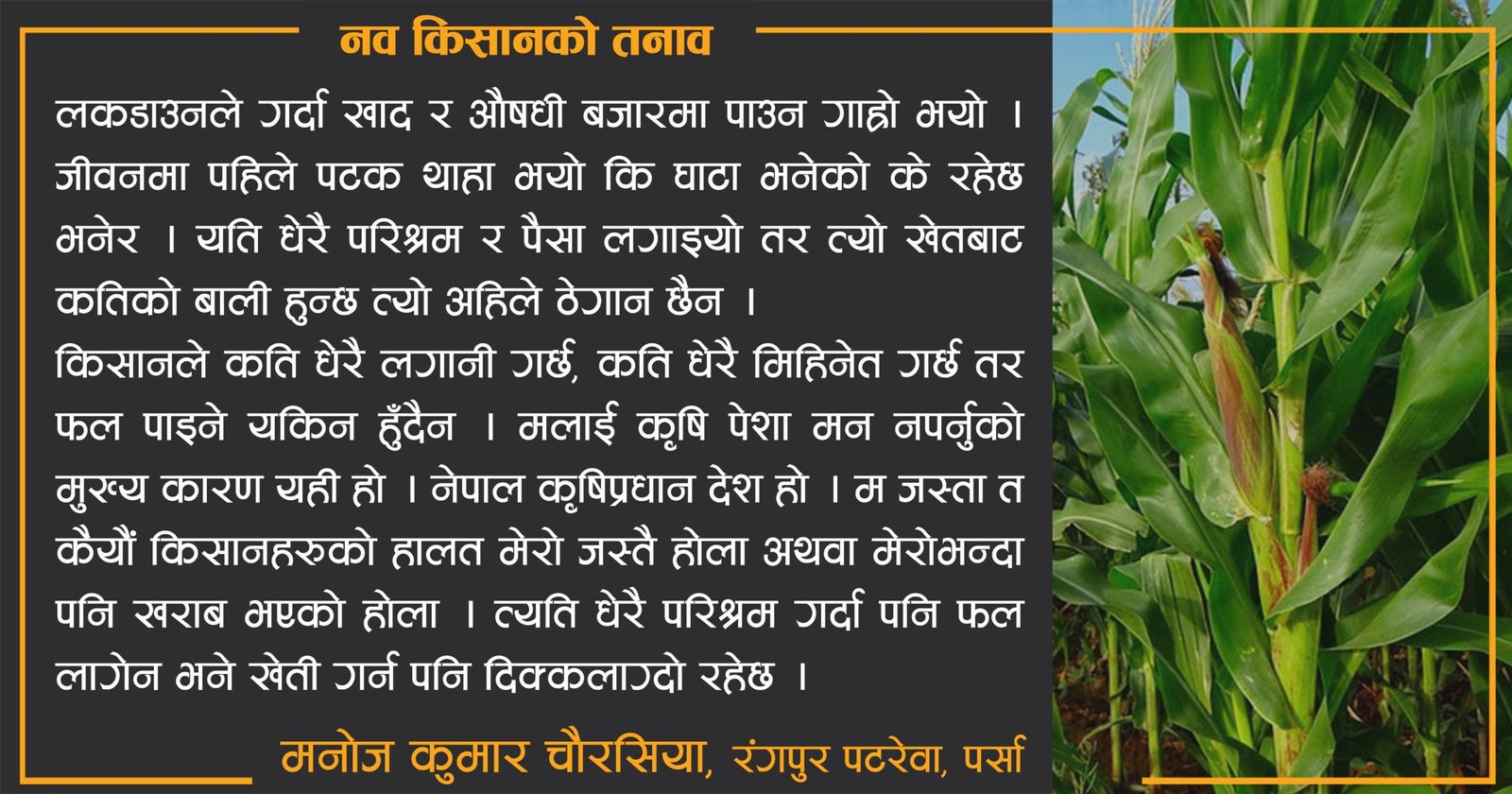 म मनोज कुमार चौरसिया । म २८ वर्षको भएँ । म सुगौली गाउँपालिका रंगपुर पटरेवामा बस्छु । मेरो लागि यो लकडाउन नरिवल जस्तो छ । बाहिरबाट हेर्दा कडा देखिने तर भित्र नरम ।