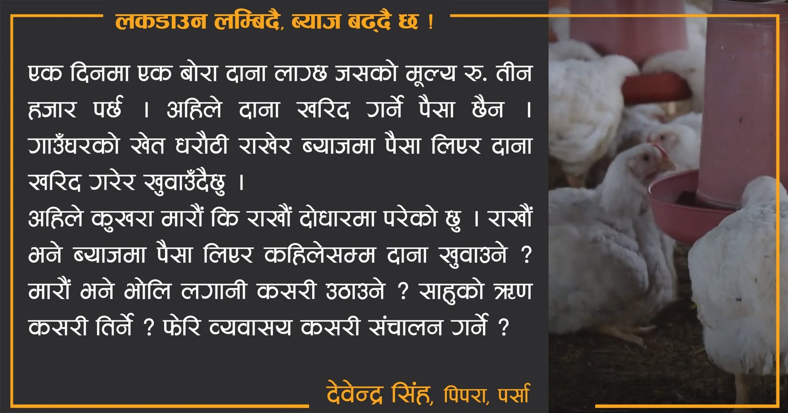 म देवेन्द्र सिंह। मेरो घर बहुदरमाई नगरपालिका वडा नं. १ पिपरा टोलमा पर्छ। मैले कुखुरा पालेको छु। २०७० सालमा यो व्यवसाय सुरु गरेको हुँ। यसमा अहिलेसम मैले रु. बीस लाख जति लगानी गरेको छु। यो मैले अहिलेसम्म गरेको ठूलो लगानी हो। मलाई यस काममा मेरो भतिजोले सहयोग गर्छ। म उसलाई काम गरेको हिसाबले ज्याला दिन्छु। हामी दुई जनामध्ये एक जना खोरमै बस्छौं। एक जना दाना, औषधी तथा कुखुरा बेचेको पैसा लिन जिल्ला सदरमुकाम वीरगन्ज धाउने गर्थ्यौं।