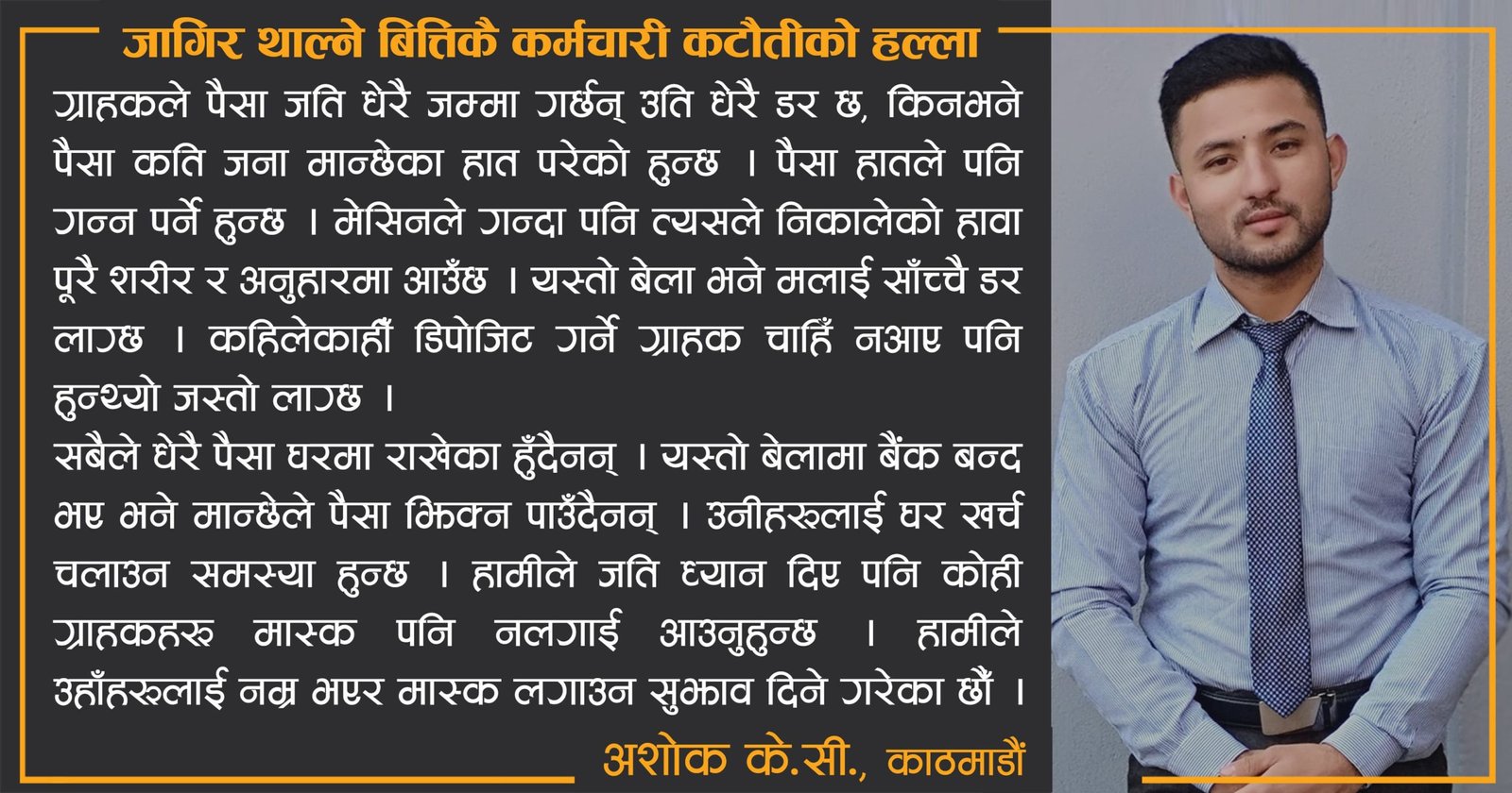 बैंकका कर्मचारीको काम पनि फ्रन्टलाइनमा काम गर्ने कर्मचारीको कामभन्दा कम खतरनाक छैन । हामीले पनि मान्छेहरूसँग नजिक भएर काम गर्नुपर्छ । यो चुनौतीपूर्ण काम हो । हामीले काम गर्न छाड्यौं भने झनै डाँवाडोल हुन्छ । त्यसैले जोखिम भए पनि अरूलाई सेवा दिन पाउँदा रमाइलै लागेको छ ।