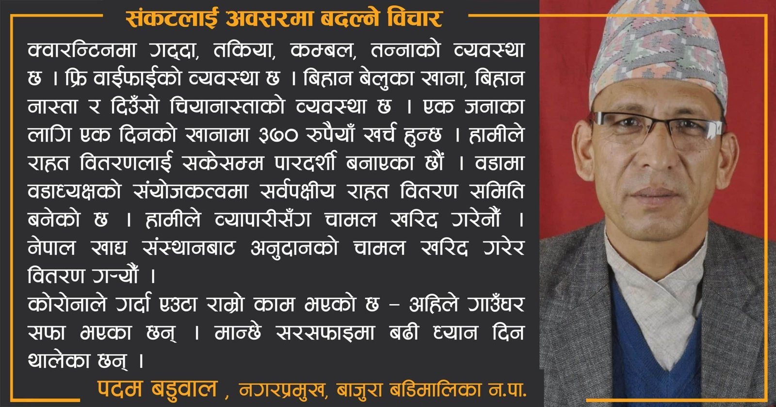 बडिमालिका नगरपालिकामा बाजुराको सदरमुकाम मार्तडी पर्छ । हामीकहाँ भएको १५ सैय्याको अस्पताल मर्मत भइरहेको थियो । त्यसैले जिल्ला समन्वय समितिको पुरानो घरमा १० बेडको आइसोलेसन वार्ड बनायौं । त्यस्तै, मार्तडीमा रहेको, ४० कोठाको मालिका उच्च माविको सरसफाइ गर्यौं र त्यसमा कार्पेट हालेर १५० जना अट्ने क्वारन्टिन बनायौं ।