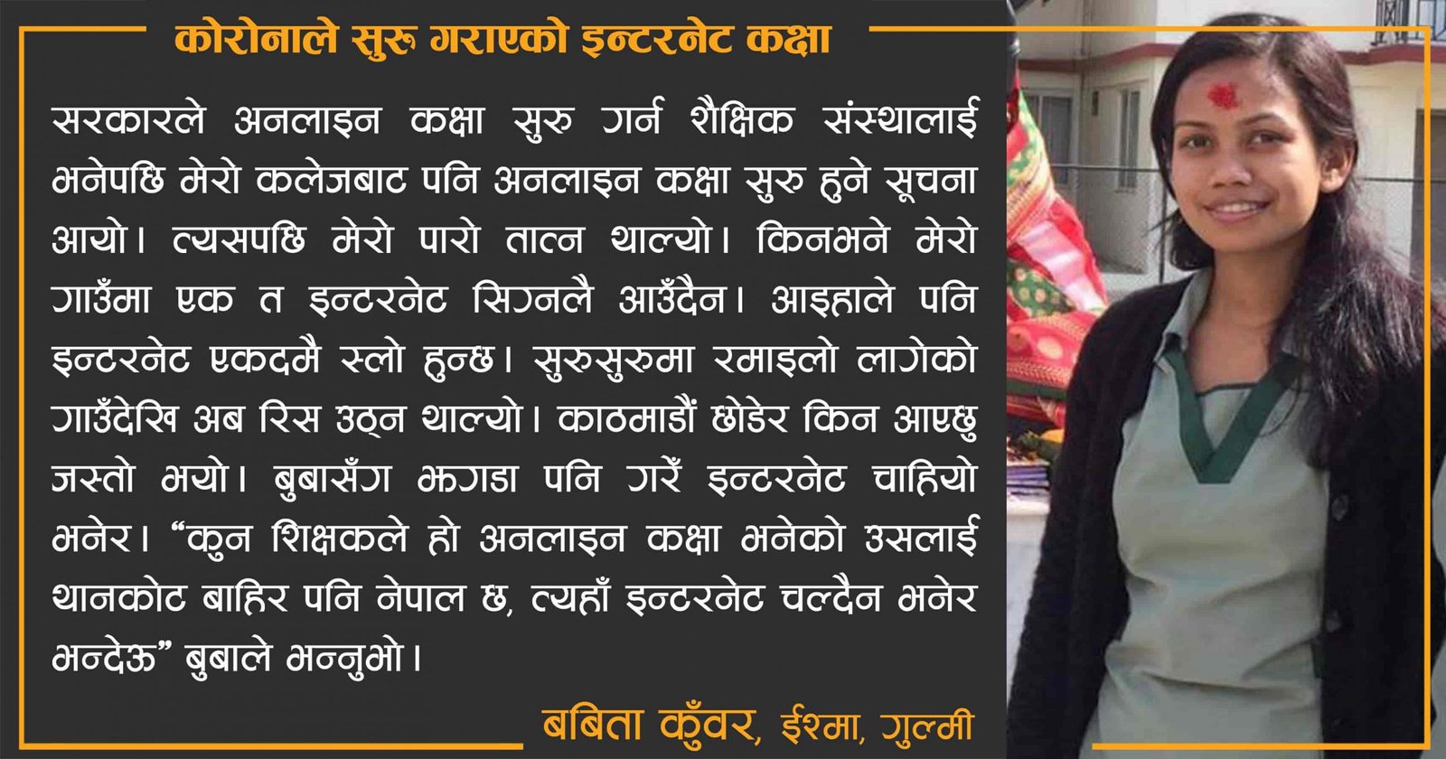 म नेपाली सेना स्वास्थ्य विज्ञान संस्थानमा नर्सिंङ दोस्रो वर्ष पढ्दै छु। म काठमाडौं पढ्न गएको ५ वर्ष भयो। त्यसबीचमा गाउँ आउने भनेको दशैँ-तिहारमा मात्र हो। बिहानै काठमाडौंमा गाडी चढ्यो भने घर पुग्दा साँझ पर्छ। गाउँ आएपछि खूब रमाइलो भयो। ममीबुबा गाउँमा खेतबारीको काम, घाँस-दाउरा गर्नुहुन्छ। म गाउँ पुग्दा बारी खाली थियो। मकै छर्ने, मल हाल्ने र जोत्ने काम म आएपछि सुरु भयो। हामी नआएको भए ममीलाई गाह्रो हुन्थ्यो। कोरोनाको डरले भए पनि हामी घर आएपछि यसपालि ममीलाई रमाइलो लाग्यो। हामी नहुँदा चैतको हावाहुरी, पसिना धूलो ममी एक्लैले खेप्नुहुन्थ्यो।