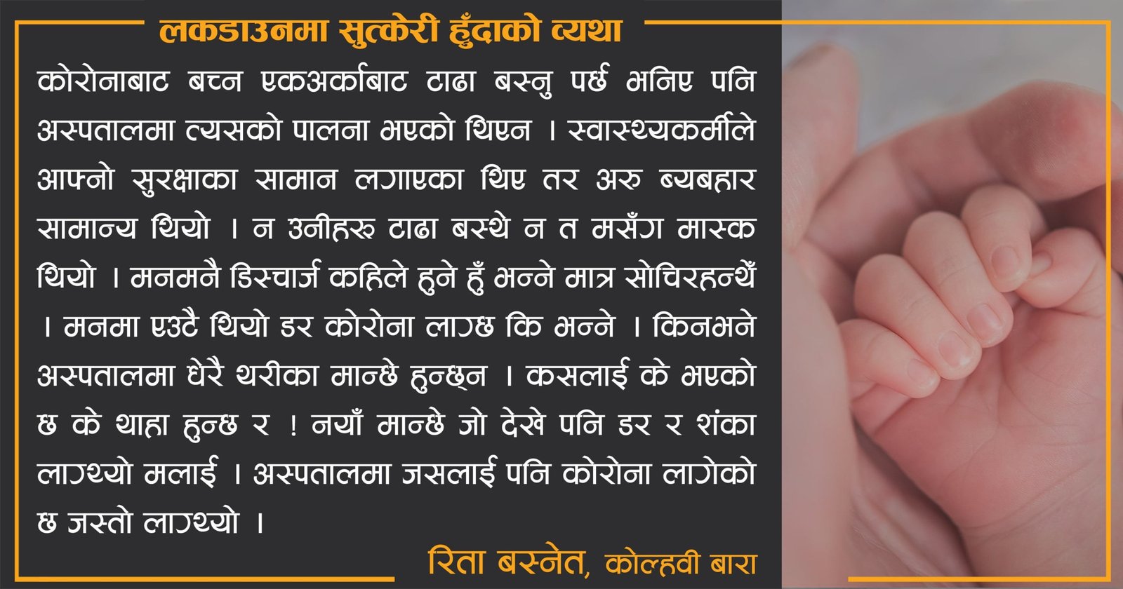 होलीपछि कोरोनाको हल्ला अलि बढ्न थालेको हो । म गर्भवती थिएँ । कोरोनाको कुरा सुनेर डर लाग्थ्यो । नेपालमा त्यस्तो धेरै नदेखिए पनि किन हो किन मलाई अलि अलि डर लागिरहन्थ्यो । झन् चैत्र ११ गतेबाट लकडाउन भएपछि त अस्पताल कसरी जाने, एम्बुलेन्स पाइएला कि नपाइएला, अस्पतालले भर्ना लेला कि नलेला भन्ने चिन्ताले म र मेरो परिवारलाई सताइरहन्थ्यो ।